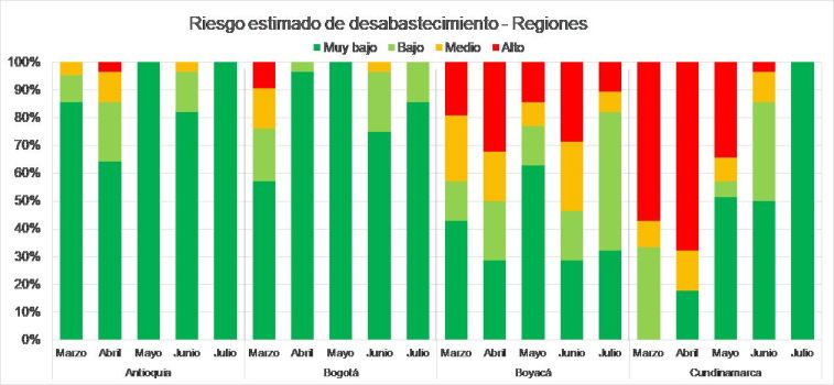 Detallando el suministro interno y dado que el origen de la distribución nacional es Bogotá, se hace un estimado del riesgo de desabastecimiento teniendo en cuenta que el tiempo de entrega ha tenido un promedio nacional de 2.9 días (estimado a partir de la información existente en las entregas a cada región; en la práctica puede ser menor).